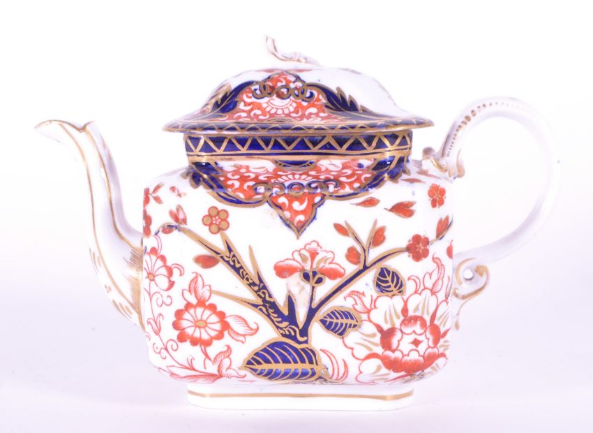 Royal Crown Derby - 1882 china Imari patterned lidded tea pot with red and blue floral design and gilt detailing. Makers mark printed to the underside. Measuring approx. 12cm x 17.5cm. Tea pot lid AF.