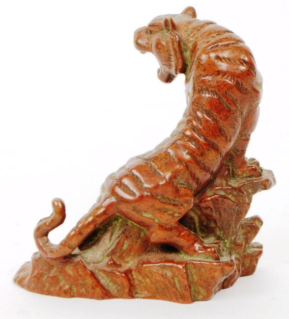 A 19th century red bronze Chinese zodiac tiger figure / ornament. The tiger on a stepped base in a standing positing looking back. With Chinese characters to front and base.