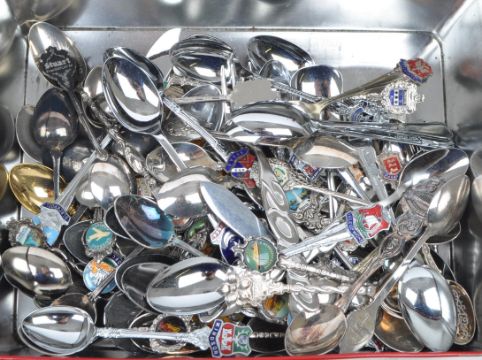 Large extensive collection of commemorative giftware silver plate and white metal tea / display spoons. To include pewter cased spoon from Connecticut, Minehead, brass figure spoon, Keswick, Australia, Walt Disney World, Syndey Opera House, Brisbane Airport, Massachusetts, Tirol and many other examples.