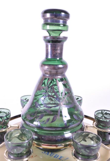 Late 20th century white metal and green glass decanter set comprised of a decanter and six shot glasses decorated with a silver colour overlay and raised on a glass and white metal base. Measuring approx. 25cm tall.