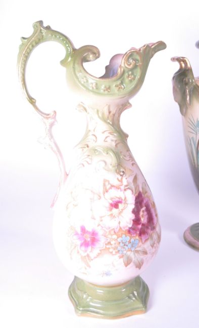 Two pairs of early 20th century continental pottery vases and ewers / jugs, both in a green and pink / cream colourway. Twin handled bases decorated with transfer designs of ladies to the main body with gilt detailing and numbered 592 to the underside, and ewers with a transfer design of flowers with gilt detailing and numbered 1099 to the underside. Largest piece measuring approx. 35cm x 18cm.