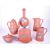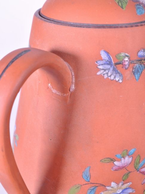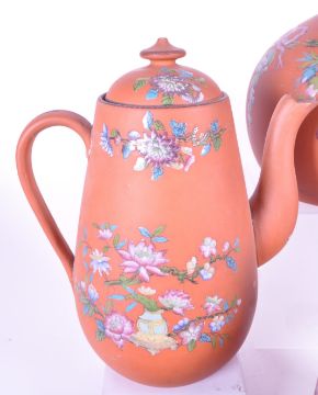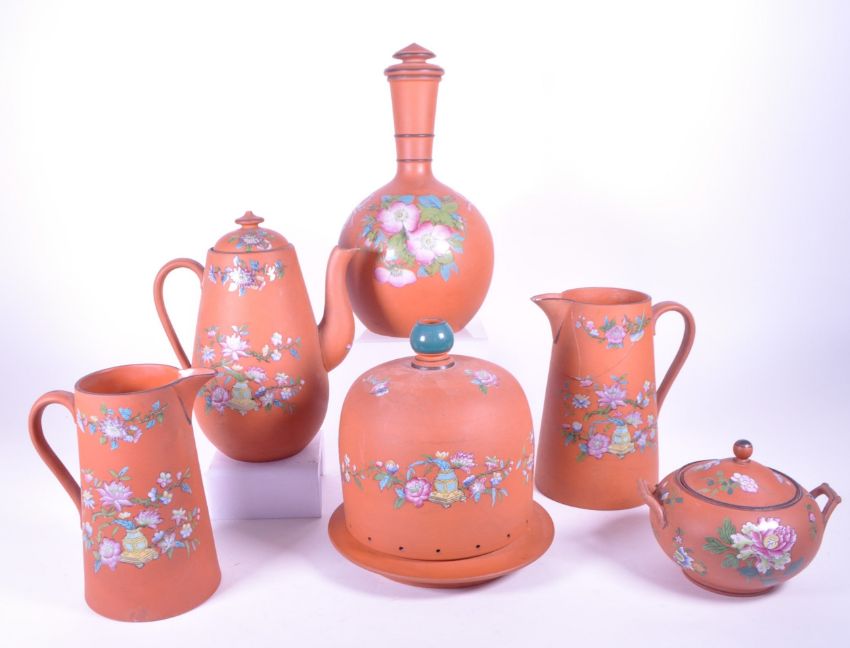 A collection of 19th century Rosso Antico tableware items. To include cloche, water jugs, teapot, twin handled vase with lid and flat bottom vase. Hand painted enemalled floral decoration on terracotta construction. AF.