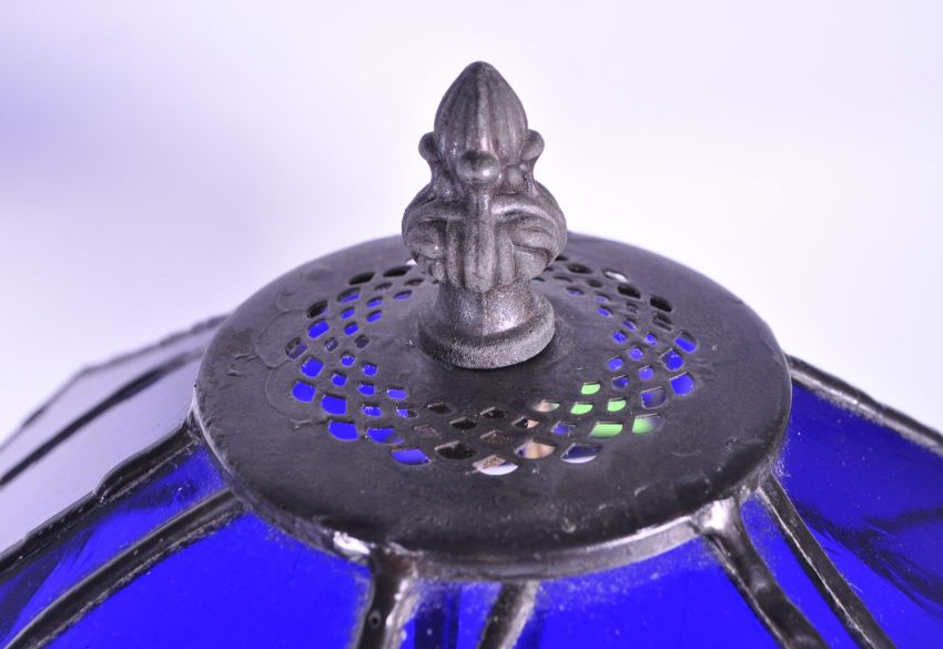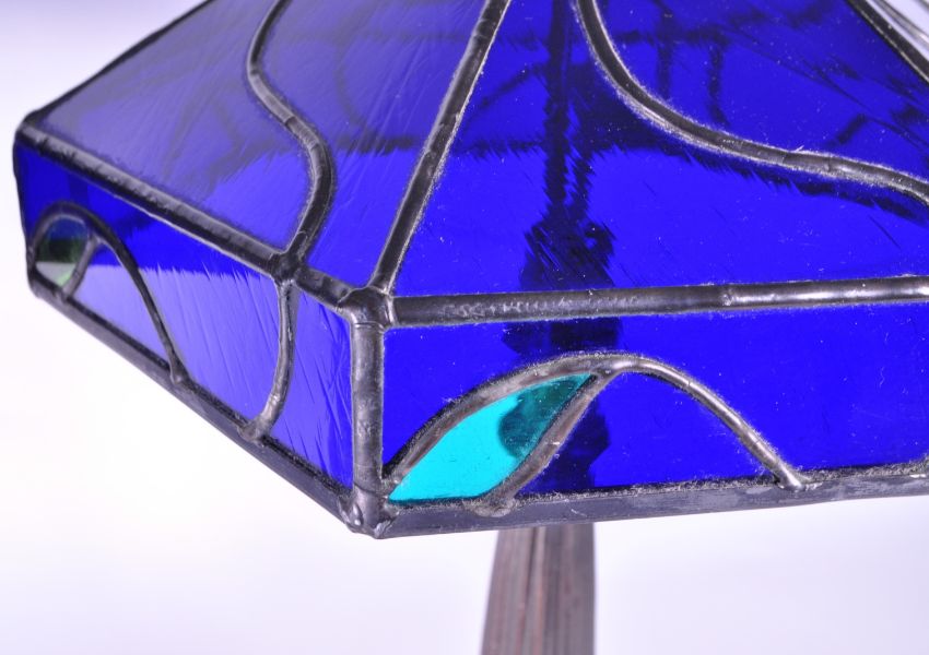 Loevsky & Loevsky - Pair of late 20th century art nouveau style lamps with metal bases and hexagonal Bristol blue glass shades. Measuring approx. 43.5cm tall.