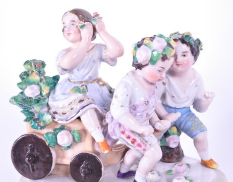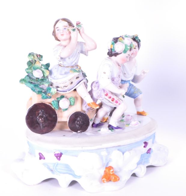 Early 20th century porcelain candlestick holder and cruet set. Candlestick holder in the manner of Sitzendorf with relief hand painted figures, flowers and leaves to the main body, with a plinth style base and raised on three scrolled legs, makers mark to the underside. Cruet set accompanied by a lid decorated with relief hand painted child figures sitting on a cart, opening to reveal a salt and pepper pot. Largest piece measuring approx. 32.5cm x 17cm.