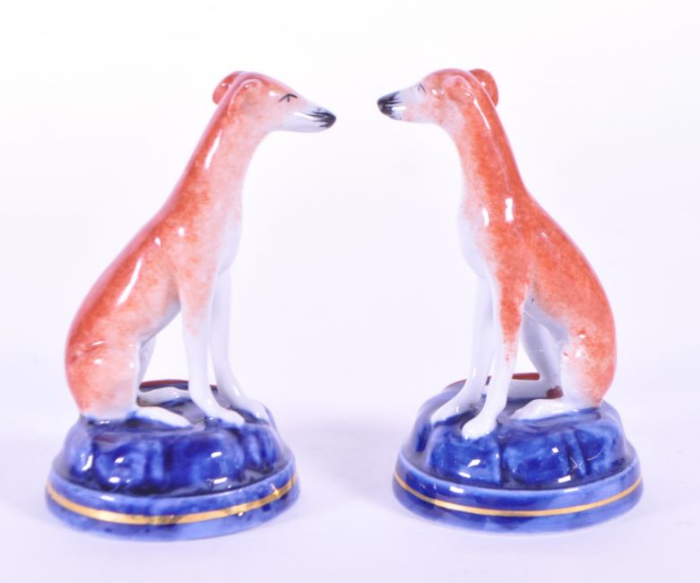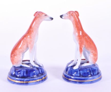 Two 19th century ceramic Staffordshire dogs. Featuring a whippet / greyhound in a burnt sienna glaze sat upon a round plinth base in a blue glaze with gilt detailing. Measuring approx. 10.5cm tall.