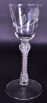 Collection of 18th / 19th century George II and III liqueur and sherry glasses, three of which with acid etched designs such as a Jackdaw, Tudor Rose, and flowers. Accompanied by a 1956 John Grinsell & Sons silver topped crystal cut decanter with hallmarks and lock and key. Largest measuring approx. 18.5cm tall.