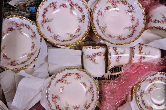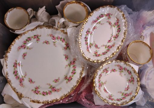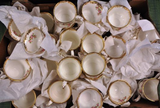 Royal Albert - Dimity Rose - Late 20th century extensive china porcelain tea / dinner service. Comprised of tea pots, tea cups, saucers, small plates, large plates, steak plates, soup plates, mugs, gravy boat, cruet set, egg cups, sugar pots, cereal dishes, serving plates, oval trays, and more, totaling approximately 393 pieces. Makers marks to the underside of each piece. Pink floral design with gilt floral decoration to the rim.