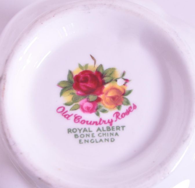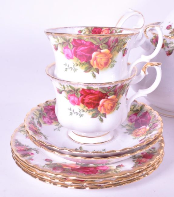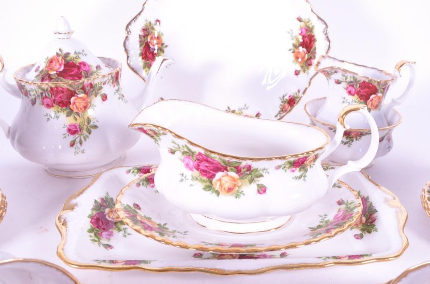 Royal Albert - Old Country Roses - A mid 20th century porcelain china pattern tea service. The collection to include a teapot, tea cups, saucers,small plates, gravy boat, tray, milk jug, and sugar bowl. Each featuring gilt detail and rose design, on white ground.