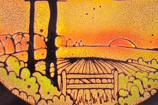 Poole Pottery - A mid 20th century 'Aegean' pattern decorative wall round plate charger depicting a country scene sunset. Together with a similar example. Impression mark and applied stamp to reverse. It measures 32cm in diameter.