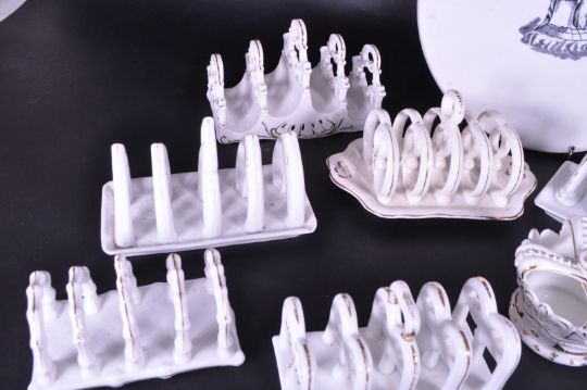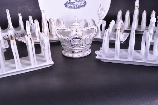 Collection of 19th / 20th century ceramic toast racks and more, including a scale plate and crown trinket dish. Featuring examples in a white colourway and gilt detailing. Scale plate measuring approx. 31cm x 31cm.