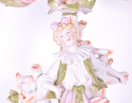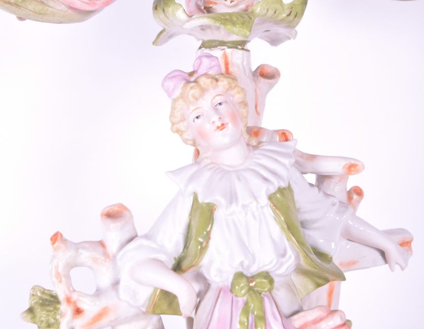 Sitzendorf - 19th century porcelain candelabra. On a naturalistic base with female figure in typical clothes, on a central branch column. With three curved arm candle stick holders in the form of bud flowers. In a pink and green hand painted colourway. AF. Blue marks to underside.
