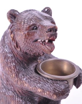 20th century German black forest wooden carved bear match strike figure with metal bowl match holder and England's Glory match stick positioned underneath where the bear is sitting. Raised on a rectangular wooden plinth style base. Measuring approx. 16cm x 6cm x 9cm.