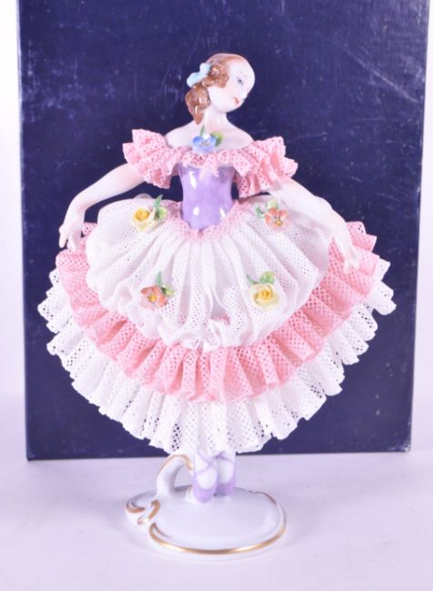 Aelteste Volkstedt - Mid century German porcelain dancing lady figurine no. V2001. Decorated with a pink and white lace dress encrusted with delicate hand painted relief flowers. Makers mark and number stamped to the underside of the figure. Housed within the original box. Measuring approx. 15cm tall (without box). AF.