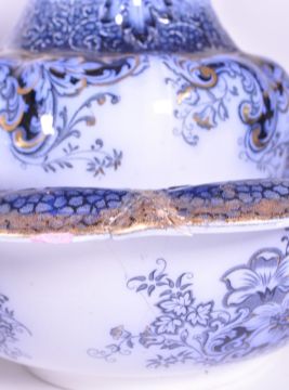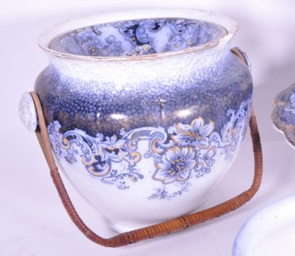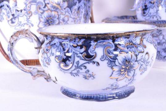 Alfred Meakin - Ormonde - Early 20th century semi-porcelain wash set. Decorated in a blue and white design with gilt detailing. Comprised of a large bowl, large jug, slop pail and chamber pot. Makers mark to the underside of each piece. Large bowl measuring approx. 14cm x 42cm.
