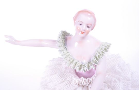 Sitzendorfer Porzellanmanufaktur - 20th century German porcelain dancer ballerina lady figure. Featured in a white and green lace dress. Raised on a circular plinth style base with gilt detailing and encrusted hand painted relief flowers, with makers mark to the underside. Housed within the original box. Measuring approx. 24cm tall (without box).