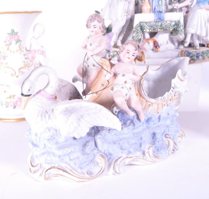 Collection of five 20th century porcelain classical figures, comprised of a 1987 The Franklin Mint 'The First Embrace' mantel clock, a pair of 1989 The Franklin Mint 'Cherubs of Love' twin handled vases, an early 20th century continental hand painted vase decorated with cherubs and a swan pulling a boat along waves, and an early 20th century continental mantel clock, with signs of restoration. Largest piece measuring approx. 25cm x 23cm x 12cm. Sold AF.
