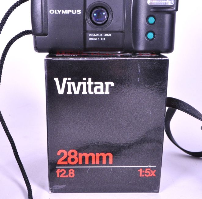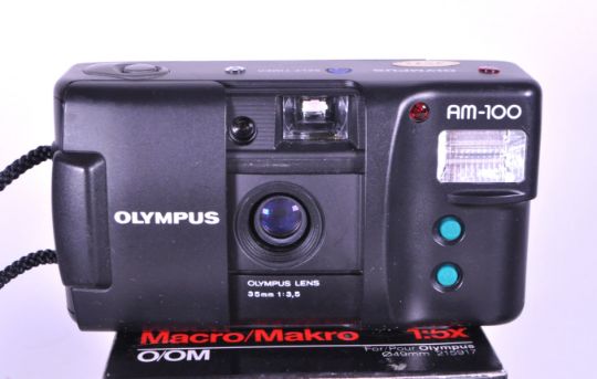 Three late 20th century Olympus film camera and lens. Comprised of the 1979 Olympus OM 10 film camera, the 1967 Olympus Trip 35 film camera, and the Olympus AM-100 film camera. Also featuring a Vivitar 28mm f2.8 Macro lens housed within the original box.
