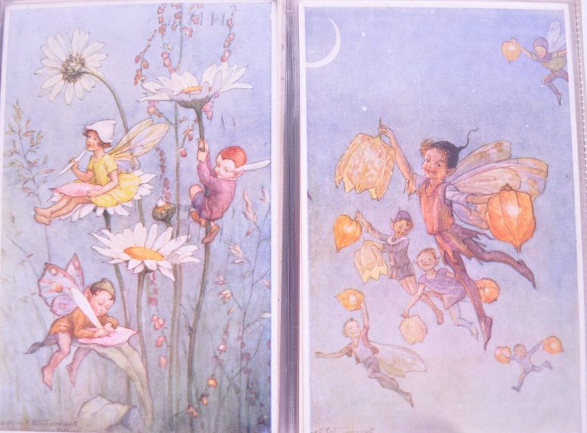 A vintage mid 20th century circa 1970s mythical fairies postcard collection. To include artists Rene Cloke, L. R. Steele, Agnes Richardson, Margaret Tarrant, and M Sowerby. Polychrome decoration with other woodland folklore creatures. House within ablum