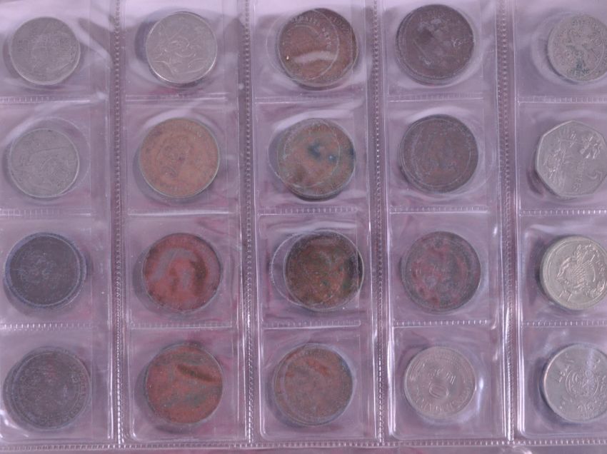 Collection of early 20th century & later United Kingdom & foreign circulated coins. Including the Dominican Republic 1990 medio peso, 1984 fifty pence Queen Elizabeth II, Edwardian one penny, Mauritius King George VI One Rupee, Sierra Leone 1964 twenty cents, 50 Ptas Juan Carlos I Espana, republic of Trinidad and Tobago food for all one dollar and many other examples. Collected and displayed over two albums.