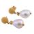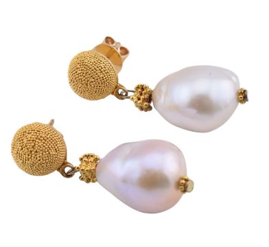 A pair of 18ct gold and baroque south sea pearl pendant earrings. The 18ct gold pendant earrings having a baroque south sea pearl surmounted by round textured hemisphere finial to straight posts with butterfly back fastener. Marked 750 to butterfly back fasteners. Measures 3cm x 1.3cm. All weights, measurements and sizes are approximate.