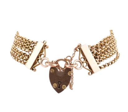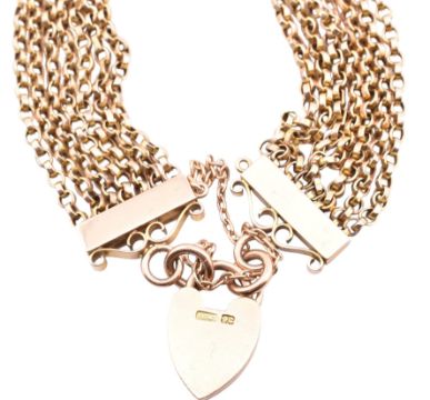 A 9ct gold multi-strand chain bracelet with heart padlock clasp. The 9ct gold bracelet comprised of seven strands of chain links with polished bars to heart padlock clasp and safety chain. Marked 9c. Sponsor's mark JC&S. Marked 9c to heart padlock clasp verso. Bracelet chain unmarked however surface tests indicate gold. Measures 21cm. All weights, measurements and sizes are approximate.
