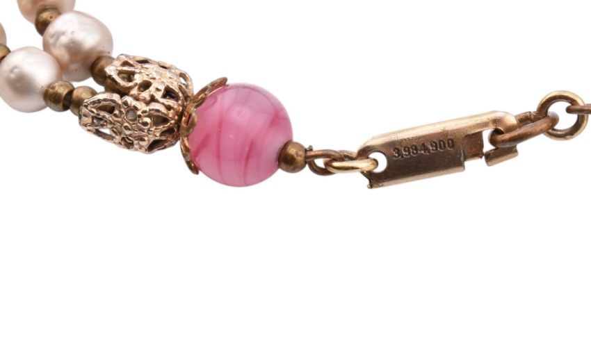 A Miriam Haskell beaded pendant necklace. The Miriam Haskell double strand necklace comprised of green and pink round glass beads interspersed by simulated pearls to cluster pendant set with beads, white stones and having gold tone metal foliate decorations to triple bead tassel. Signed Miriam Haskell to clasp. Measures 57cm. Weighs 106g. All weights, measurements and sizes are approximate.