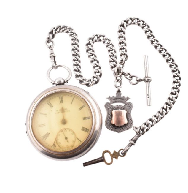A hallmarked silver pocket watch on chain. The H. Samuel silver pocket watch having a spade hand, Roman numeral indices and subsidiary seconds dial to polished silver case with vacant cartouche to verso, hallmarked for Chester, 1897 together with sponsor's mark H.S. The watch strung on a hallmarked silver curb link watch chain with shield fob and T-bar. Watch chain hallmarked for Birmingham, 1918 together with standard for sterling silver marked to each link. Shield fob hallmarked for Birmingham, 1918. T-bar hallmarked for Birmingham, 1918. The watch to come with a metal case. Watch measures 7.5cm x 5cm. Watch chain measures 40cm. All watches are sold as untested, therefore without warranty. All weights, measurements and sizes are approximate. Total weight 208g.