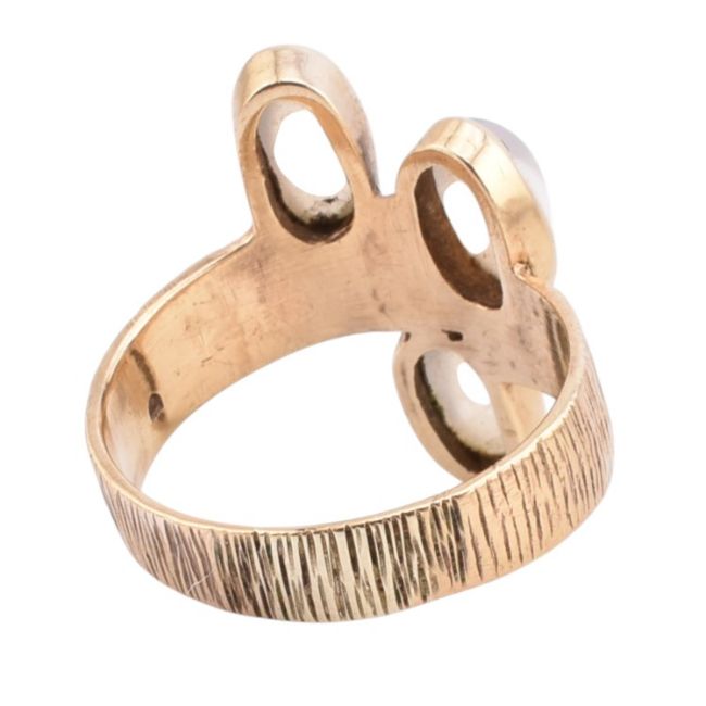 A 1970s hallmarked 9ct gold and moonstone ring. The modernist ring set with three oval cut moonstones to a textured bark-style band. Hallmarked for London, 1975. Sponsors mark BJ within a shield cartouche. Weight 5.7g. Size R. All weights, measurements and sizes are approximate.