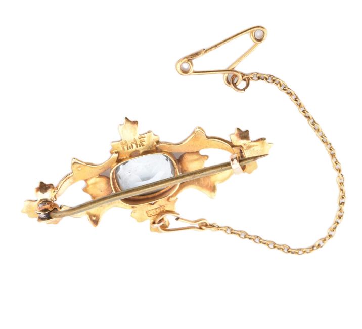 A 15ct gold aquamarine and pearl brooch pin. The antique 15ct yellow gold brooch pin set with a central millegrain set oval cut aquamarine to decorative, pierced brooch pin set with seed pearls to hinge pin and c-clasp verso with safety chain. Marked 15ct to verso. Maker's mark H.H.F. Measures 4cm x 2cm. All weights, measurements and sizes are approximate.