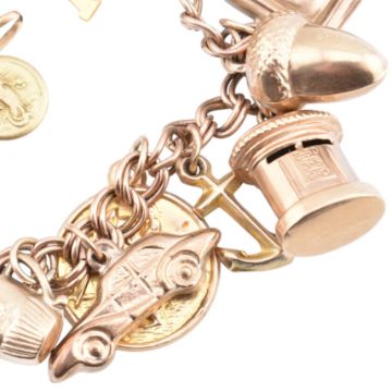 A hallmarked 9ct gold charm bracelet and charms. The hallmarked 9ct yellow gold curb link chain bracelet strung with twenty charms to heart padlock clasp and safety chain. Charms to include a watering can, barrel, anchor, wishbone, pig, heart, dog, St Christopher, post box and more. All charms hallmarked or marked 9ct. Heart padlock clasp hallmarked for Birmingham, 1980. The loose charms to include a hallmarked 9ct gold treble clef charm, hallmarked for Birmingham, 1988. An 18ct gold medallion charm, marked 750 to verso. The charms to also include a football, mounted coral and 'A' initial charm, metal all unmarked. Bracelet measures 17.5cm. All weights, measurements and sizes are approximate. Total weight 27.3g.