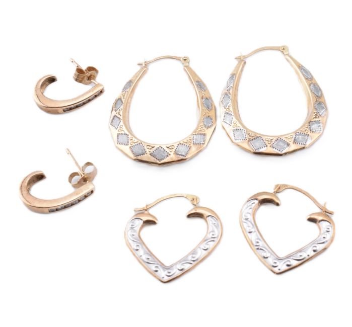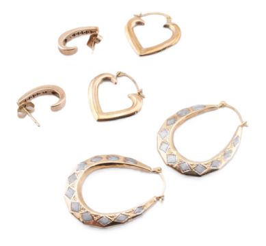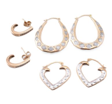 A collection of 9ct gold hoop earrings. The lot to include a pair of hallmarked 9ct gold and diamond half hoop earrings with straight posts and butterfly back fasteners, hallmarked for Birmingham together with sponsor's mark SG. A pair of 9ct gold bi-colour hoop earrings, marked 375 to latch fasteners. The lot to also include a pair of 9ct bi-colour gold heart-shaped hoop earrings, marked 375. 9ct gold and diamond earrings measure 1.2cm x 0.3cm. Oval hoops measure 2.8cm x 2.2cm. Heart hoops measure 1.9cm x 1.8cm. All weights, measurements and sizes are approximate.