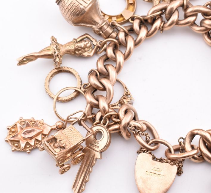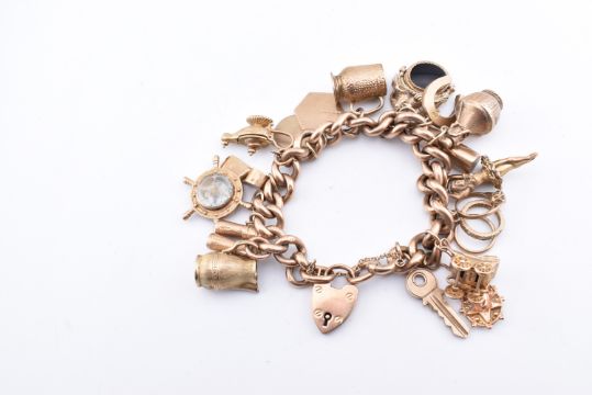 A hallmarked 9ct gold charm bracelet. The charm bracelet strung with 17 charms to a padlock clasp. The charms to include key, pram, ring set, flagon, doves over a swivel fob, horseshoe, Grants whiskey, tankard, St Christopher, Cancer zodiac symbol, Aladins lamp, Ships wheel compass, whistle, binoculars, Jug. All charms hallmarked with the exception of one Victorian charm which appears to be an earring. Links stamped 9ct. Clasp hallmarked Birmingham date letter rubbed. Measures 19cm. All weights, measurements and sizes are approximate.