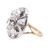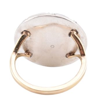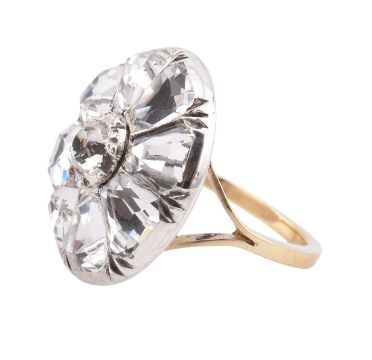 A silver & gold paste cluster ring. The ring having a central cut-down set round cut paste surrounded by a halo of mixed cut paste stones set in a circular silver mount to gold bifurcated shoulders and polished shank. Size J. Ring head measures 2cm x 2cm. Unmarked, surface tests indicate silver and gold. All weights, measurements and sizes are approximate.