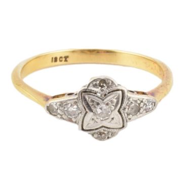 An Art Deco 18ct gold and diamond ring. The antique 18ct gold ring having a central illusion set round brilliant diamond set in a pierced white gold mount surrounded by six round brilliant cut diamonds to yellow gold shank. Marked 18ct to inner shank. Estimated total diamond weight 0.10cts. Size R. All weights, measurements and sizes are approximate.