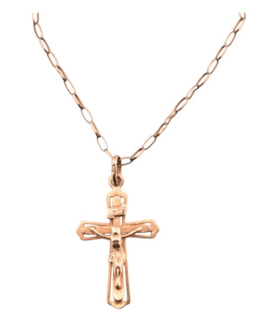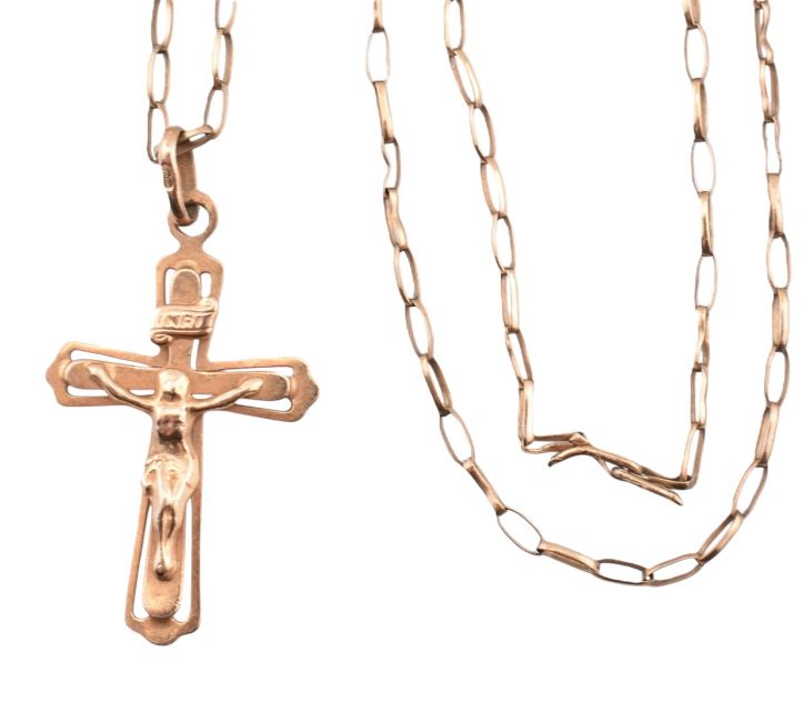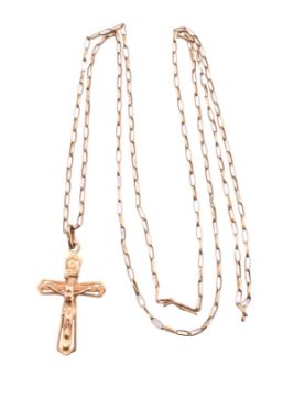 A hallmarked 9ct gold crucifix pendant necklace. The 9ct yellow gold chain necklace strung with a hallmarked 9ct gold crucifix pendant. The crucifix pendant hallmarked to verso with import mark for Birmingham, 1988 together with sponsor's mark Uno-a-erre. Necklace hallmarked for London, 1988. The chain necklace AF with hook clasp soldered together. Necklace measures 67cm. Pendant measures 3.3cm x 1.7cm. All weights, measurements and sizes are approximate.