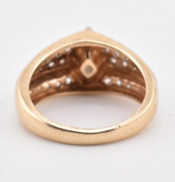 A gold and diamond fancy dome cluster ring. The yellow gold ring set with a central east-west baguette cut diamond flanked to the top and bottom by two trilliant cut diamonds to shoulders set each with nine graduating round brilliant cut diamonds. Marks to inner shank illegible. Tests indicate 14ct gold. Size R. Weighs 7.4g. All weights, measurements and sizes are approximate.