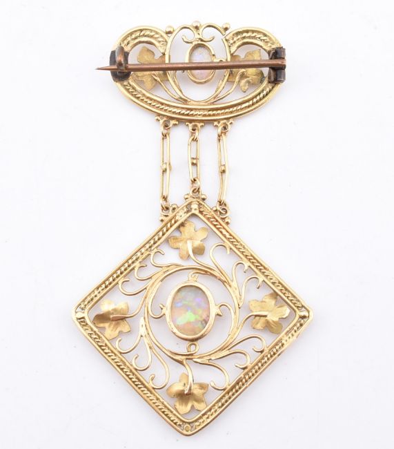 An early 20th-century gold Arts & Crafts opal double pendant brooch pin. The brooch with an opework pendant with filigree rope, ivy leaves and fronds framing an oval cut opal. The pendant is suspended by three chains from an openwork brooch with a central opal having hinged pin verso. Total weight 7.9g. Measures 6.5cm x 3.8cm at longest and widest point. All weights, measurements and sizes are approximate.