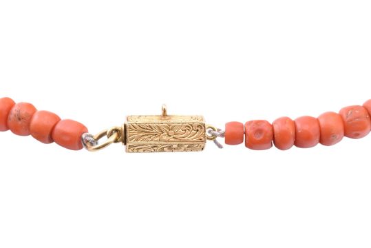 A 19th century coral bead necklace. The necklace formed with graduating coral beads having lately restrung - on a gold etched decorated barrel clasp. Clasp tests as 18ct gold. Measures 51cm. Beads 3mm - 5mm. Clasp 1.2cm