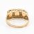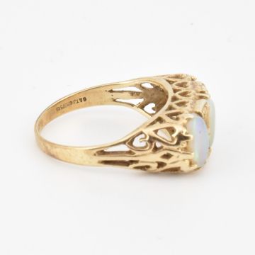 A hallmarked 9ct gold and opal three stone ring. The 9ct yellow gold ring set with three oval opal cabochons set in a decorative pierced heart mount to tapered shank. Hallmarked for Sheffield together with sponsor's mark G&T J. Size M. All weights, measurements and sizes are approximate.