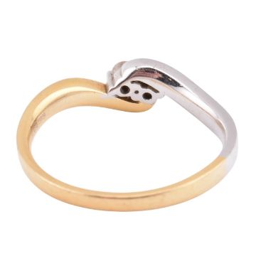 A hallmarked 18ct gold and diamond crossover ring. The 18ct bi-colour gold ring having two round brilliant cut diamonds set in a crossover mount half in white gold and half in yellow gold to tapered shank. Hallmarked for Birmingham. Sponsor's mark SG. Marked DIA to inner shank. Estimated total diamond weight 0.15cts. Size M.5. All weights, measurements and sizes are approximate.