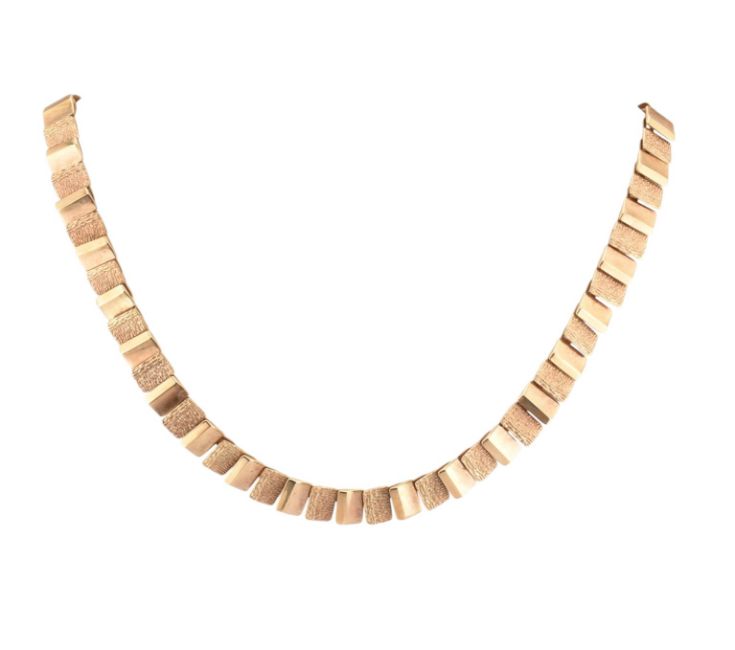 A 1960s hallmarked 9ct gold fringe collarette necklace. The necklace formed with alternating textured rectangular fringe links to an extension chain with ball finial and spring hoop lasp fastener. Import hallmarks for London 1964. Measures total length 42cm. Cased. All weights, measurements and sizes are approximate.