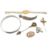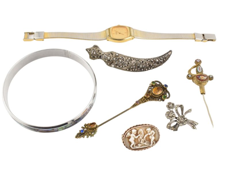 A collection of vintage jewellery and a watch. The jewellery to include a jabot pin, a micro-mosaic sword pin, a filigree scimitar brooch, an abalone inlaid bangle, a marcasite spray brooch pin, a 19th-century shell cameo brooch pin, and a Seiko quartz watch. All weights, measurements and sizes are approximate. All watches are sold as untested, therefore without warranty.