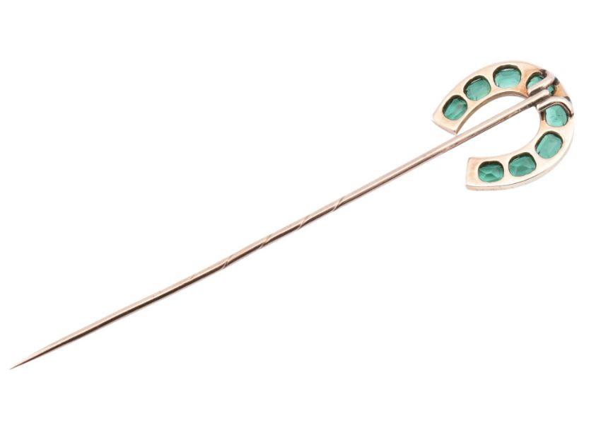A Victorian gold and green paste horseshoe stick pin. The Victorian stick pin having a horseshoe-shaped head set with eight oval cut green paste stones to twisted stick pin. Unmarked, surface tests indicate gold. Measures 8.6cm x 1.8cm. All weights, measurements and sizes are approximate.