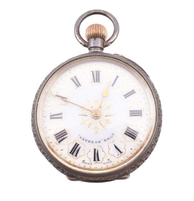A Swiss hallmarked silver fob watch with leather wrist strap adaptor case. The hallmarked silver Swiss fob watch having Roman numeral indices, spade hands and metallic decoration to all-over engraved decoration silver case with vacant cartouche to verso. Hallmarked silver with Swiss hallmarks. The fob watch to come in a leather wrist strap adaptor to enable the fob watch to be worn as a wristwatch. Fob watch measures 5cm x 3.5cm. Leather strap adaptor measures 50.4cm x 4.7cm. Combined weight 47.7g. All weights, measurements and sizes are approximate. All watches are sold as untested, therefore without warranty.