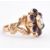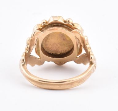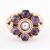 A gold amethyst and pearl cluster ring. The ring set with a central pearl framed by amethyst cabochons to bifurcated foliate shoulders and ribbed shank. Unmarked tests indicate 9ct gold. Size N. Weight 6.4g. All weights, measurements and sizes are approximate.