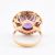 An 18ct gold and synthetic colour change sapphire ring. The 18ct gold ring having a single round cut synthetic colour change sapphire set in a pierced lattice mount to polished band ring. Stamped 750 to inner shank. Size N. All weights, measurements and sizes are approximate.