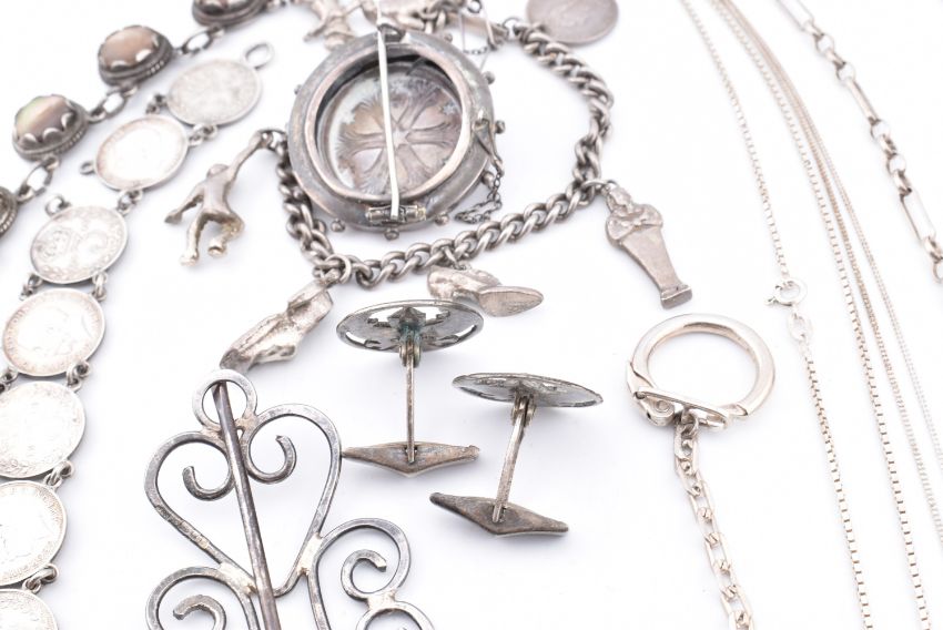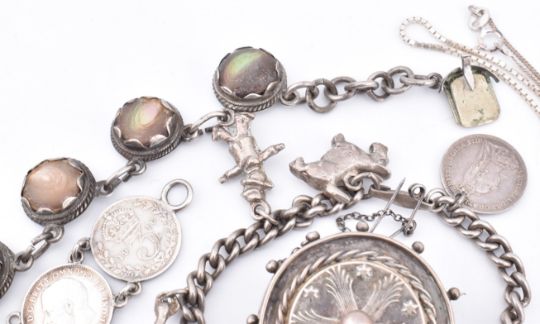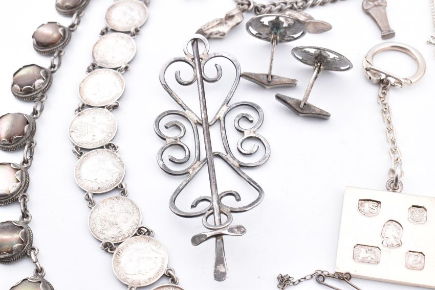 A collection of silver and white metal jewellery. The jewellery to include a charm bracelet, a three pence silver bracelet dates 1914 - 1918, George V hallmarked hair pin 1912. Siam 925 silver cufflinks, stork pendant on 925 silver chain, a 19th century roundel brooch, a gem set bar brooch, an early 20th century abalone set collar necklace - surface tests silver, A simulated pearl pendant on 925 silver chain, a hallmarked 925 fancy link chain necklace. A hallmarked Silver Jubilee ingot keyring. Total weight 171g.