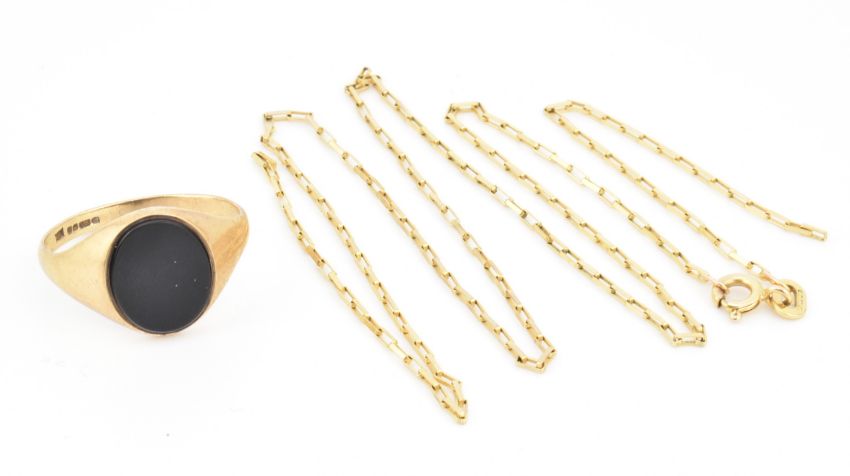 A hallmarked 9ct gold and onyx signet ring with a hallmarked 9ct gold necklace chain AF. The lot to include a hallmarked 9ct yellow gold signet ring set with an oval onyx slice to tapered shank, hallmarked for Sheffield, 1984 together with sponsor's mark AJ Co. The lot to also include a hallmarked 9ct gold paper-clip link chain necklace sold as found with broken link, hallmarked with import mark for Birmingham, 1988 together with sponsor's mark MM. Ring size P. Chain AF measures 45cm. All weights, measurements and sizes are approximate.