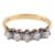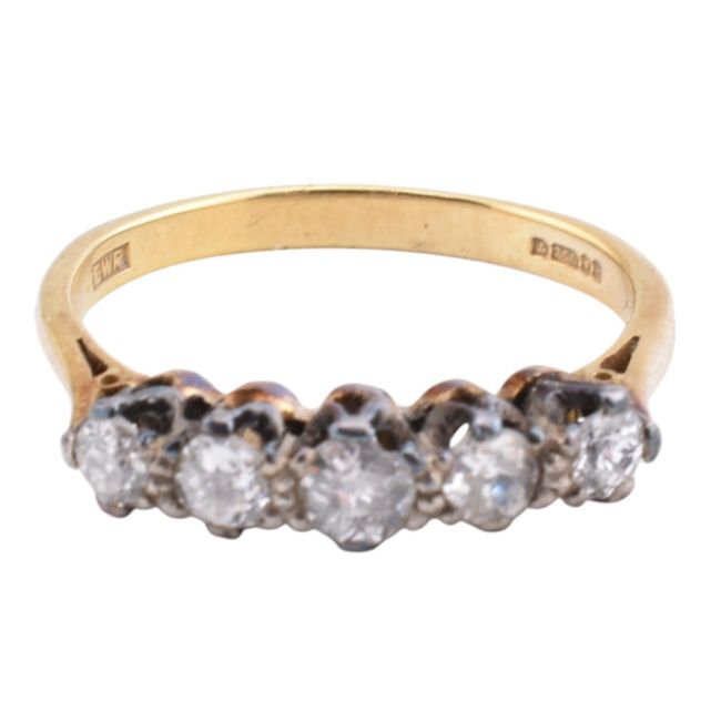 A hallmarked 18ct gold and diamond five stone ring. The 18ct yellow gold ring set with five graduating round brilliant cut diamonds to chenier shoulders and polished shank. Hallmarked for London, 1982. Sponsor's mark EWR. Estimated total diamond weight 0.60cts. Size P. All weights, measurements and sizes are approximate.