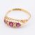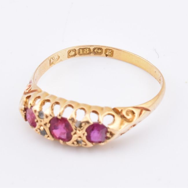 An Edwardian hallmarked 18ct gold ruby and diamond boat ring. The 18ct yellow gold ring having three oval cut rubies flanked by four diamond chips set in a pierced mount to decorative foliate engraved shoulders. Hallmarked for Birmingham, 1906. Size Q. All weights, measurements and sizes are approximate.